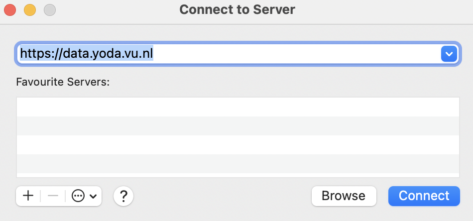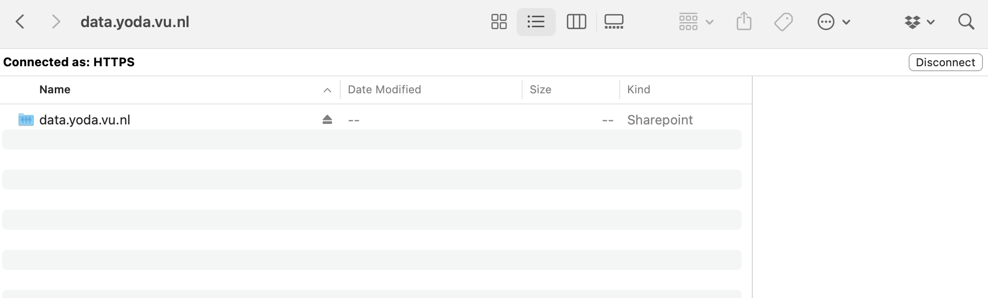 There are 2 basic ways to access Yoda data from a Mac: Mounting the Yoda WebDAV interface in finder or via file transfer tools, in which case we recommend Cyberduck. Which one works best depends on your workflow.
