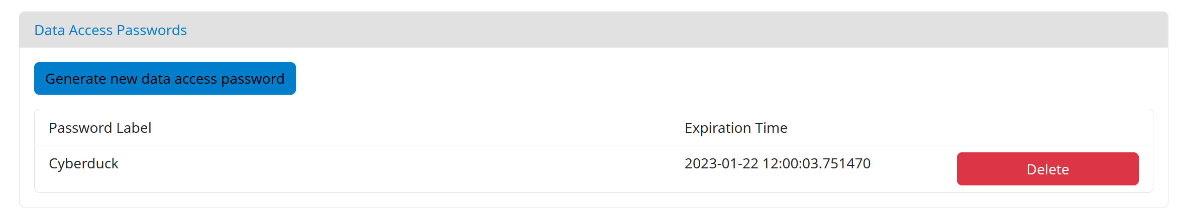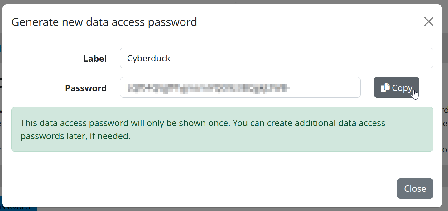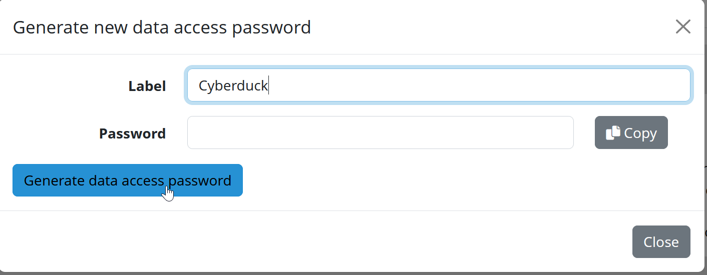 - Enter a suitable label and click on “Generate new data access password”