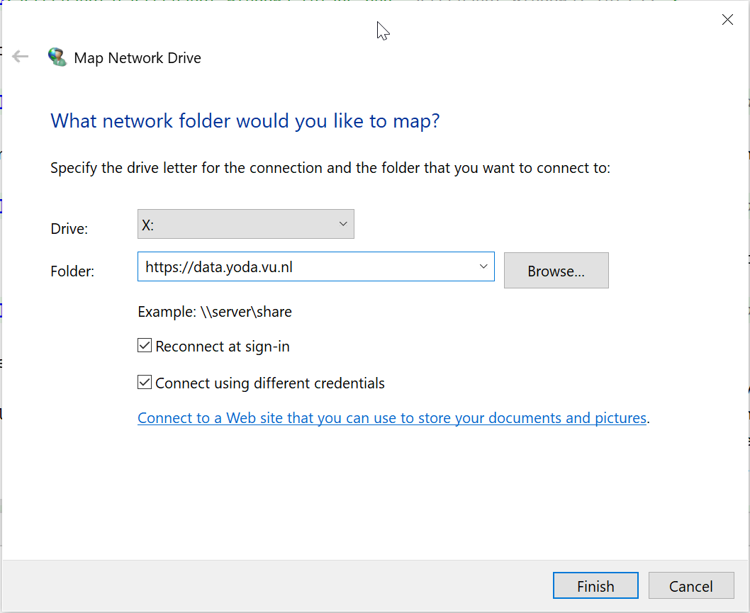 Select a drive letter — any free letter is okay. Now enter https://data.yoda.vu.nl/ in the Folder field (see table below).