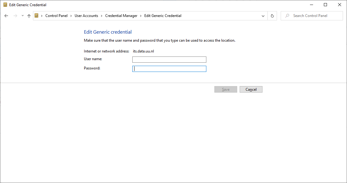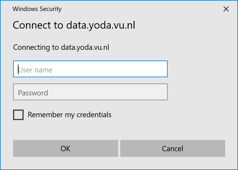 You will be prompted for a name and password. Name is your email address. Create a data access password and copy it to the Password field If you are working on your personal PC or laptop, tick the checkbox “Remember my credentials”.