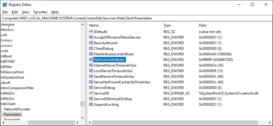 HKEY_LOCAL_MACHINE\SYSTEM\CurrentControlSet\Services\WebClient\Parameters - Open the