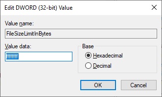 You can increase the limit on Windows 10 to 4 GB if you have a local administrator account: - Open the registry editor by pressing the start button, entering “regedit” and pressing the enter key. - If you are asked whether the registry editor should be allowed to change the system settings, confirm. - Navigate to key HKEY\_LOCAL\_MACHINE\SYSTEM\CurrentControlSet\Services\WebClient\Parameters - Open the FileSizeLimitInBytes key